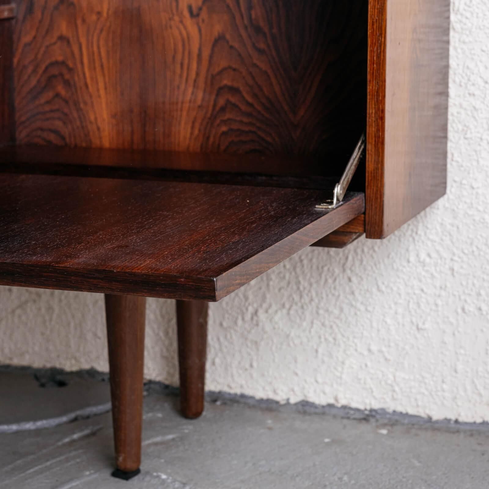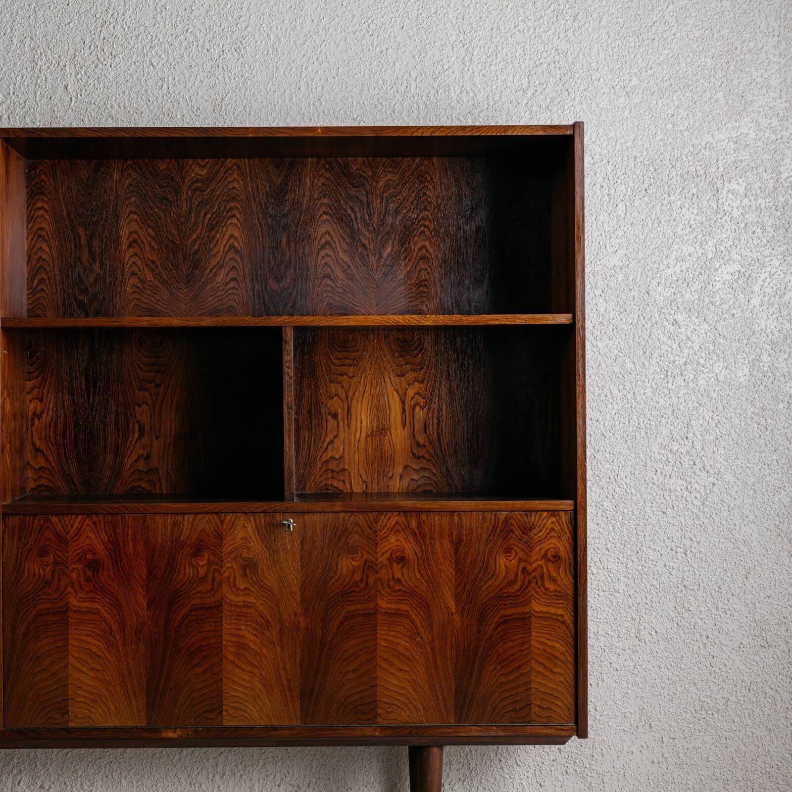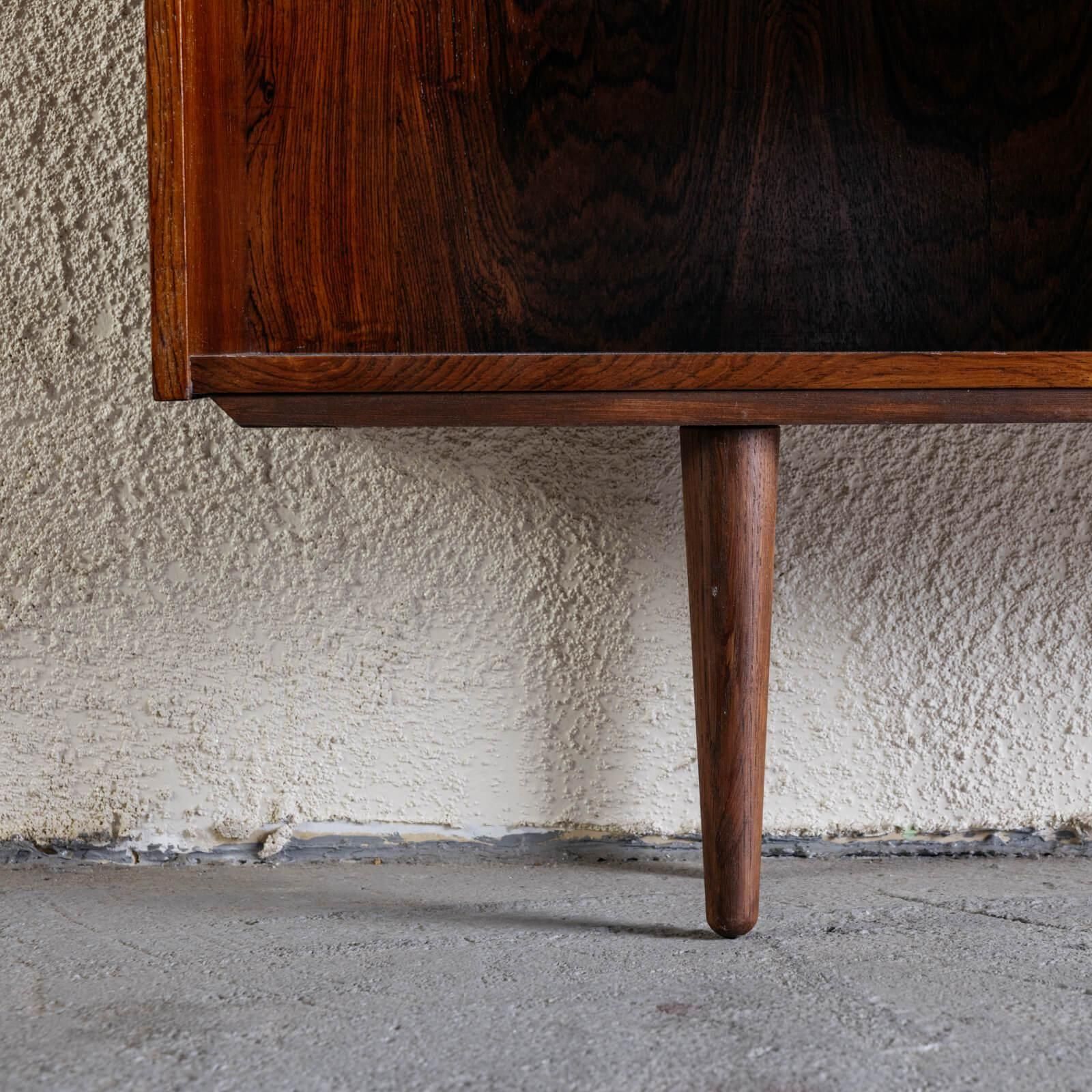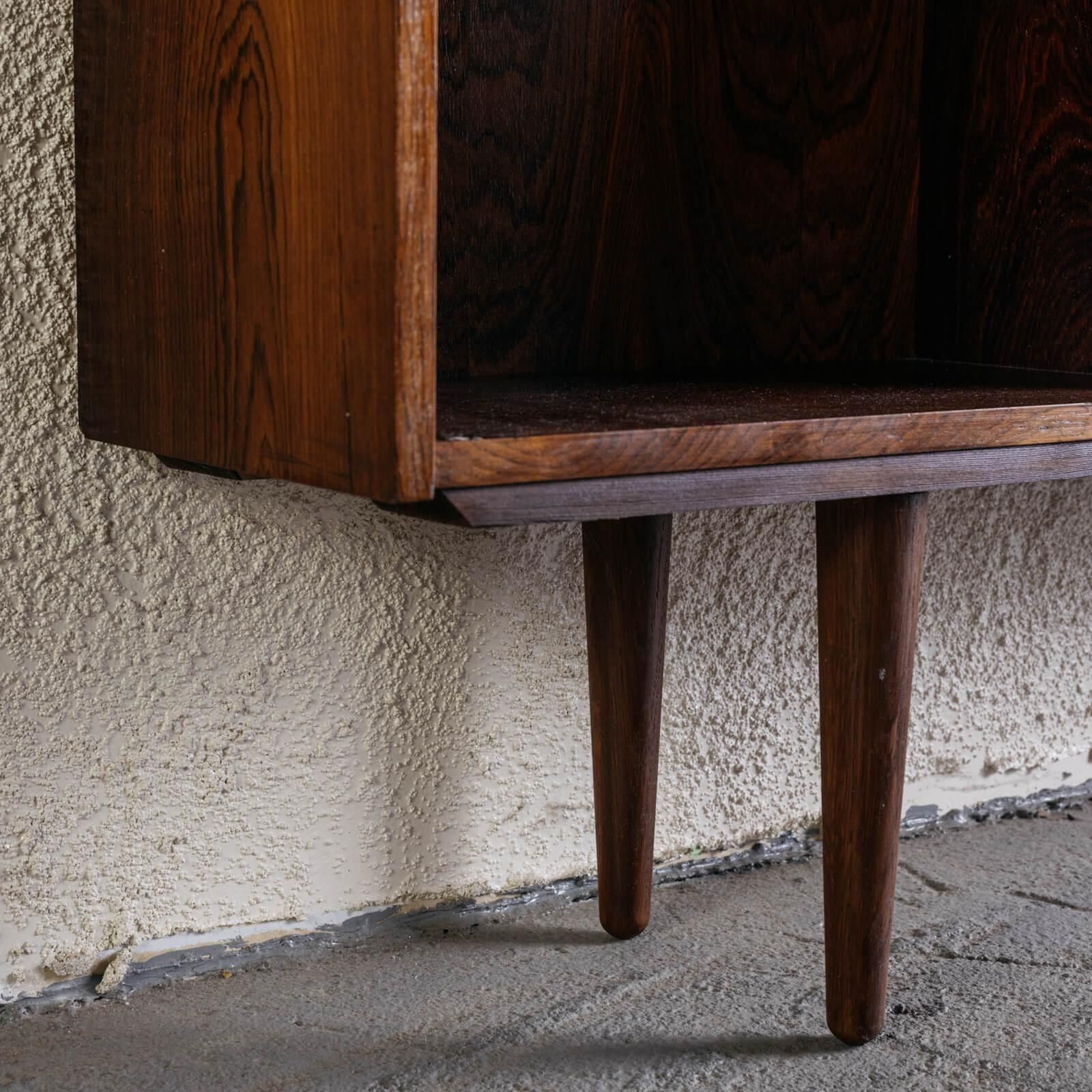 ローズウッド特有の深い木目が美しいデンマークビンテージキャビネット。棚の可動で使い勝手が良く、ディスプレイも収納も楽しめます。向かって右下段はフラップ扉付きで、見せる、隠すの両方に対応。北欧らしい脚のデザインが空間をスッキリ見せてくれます。