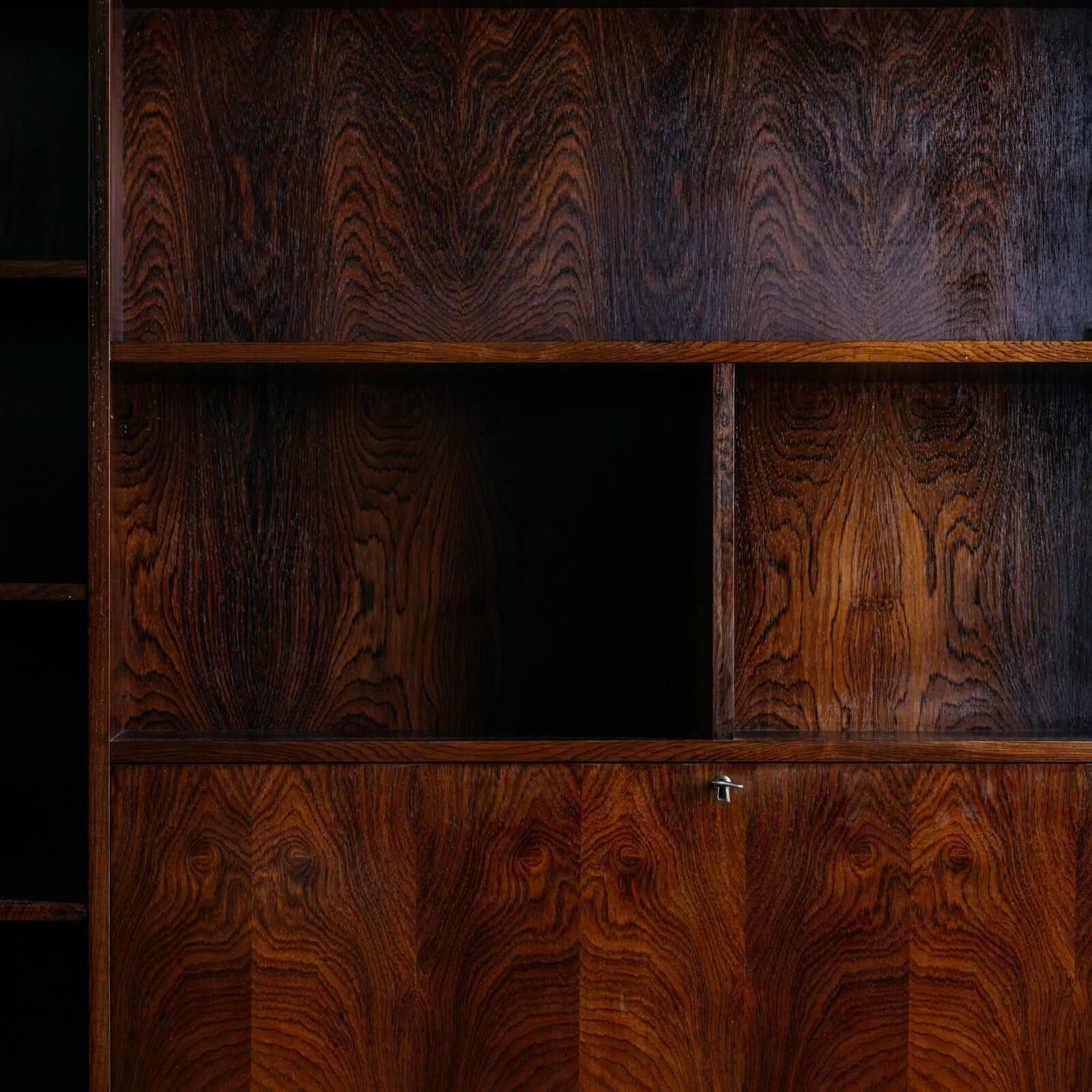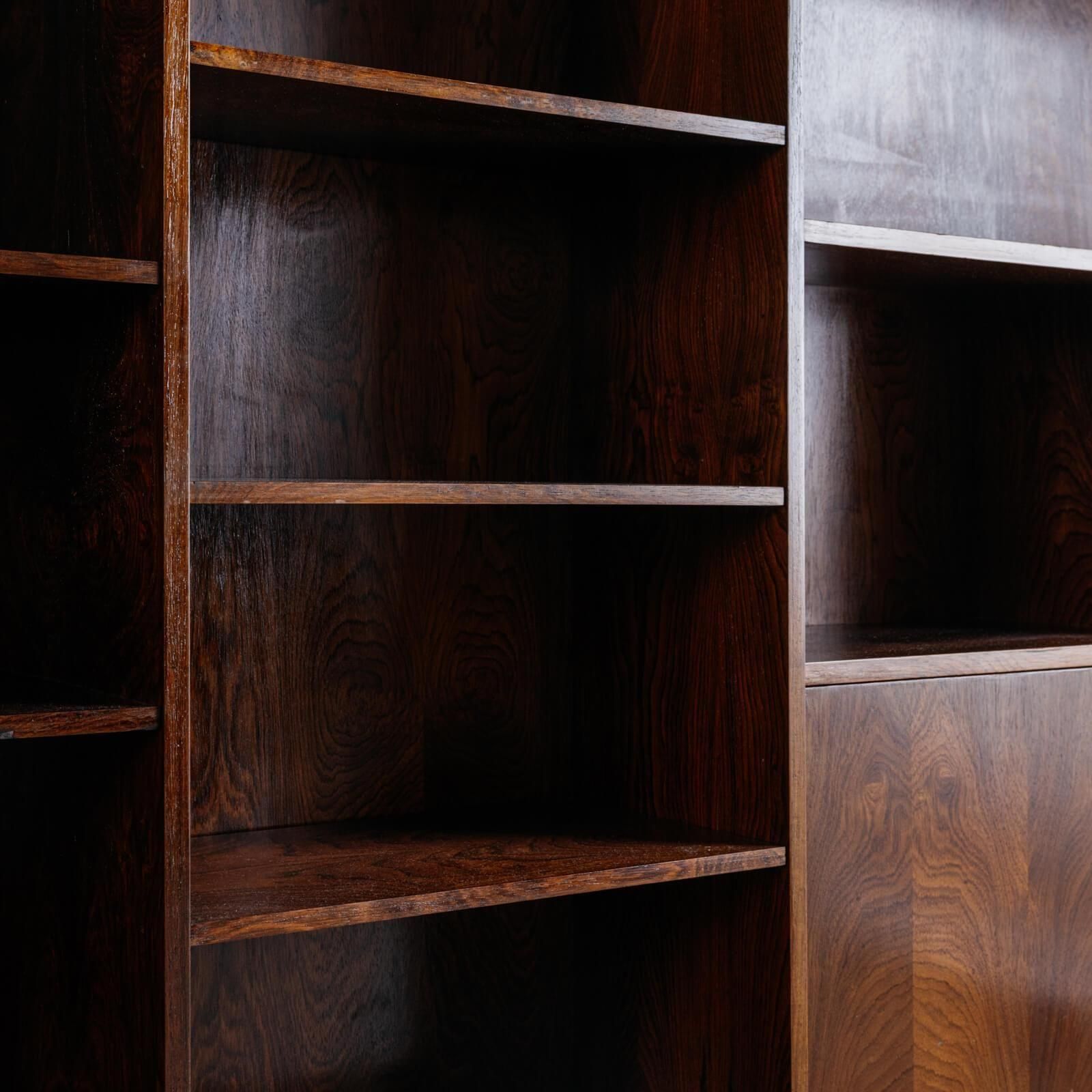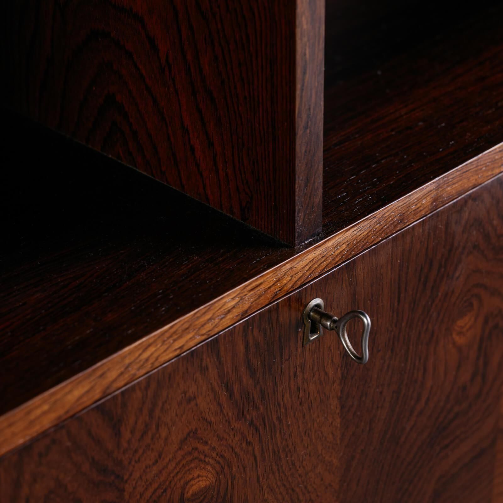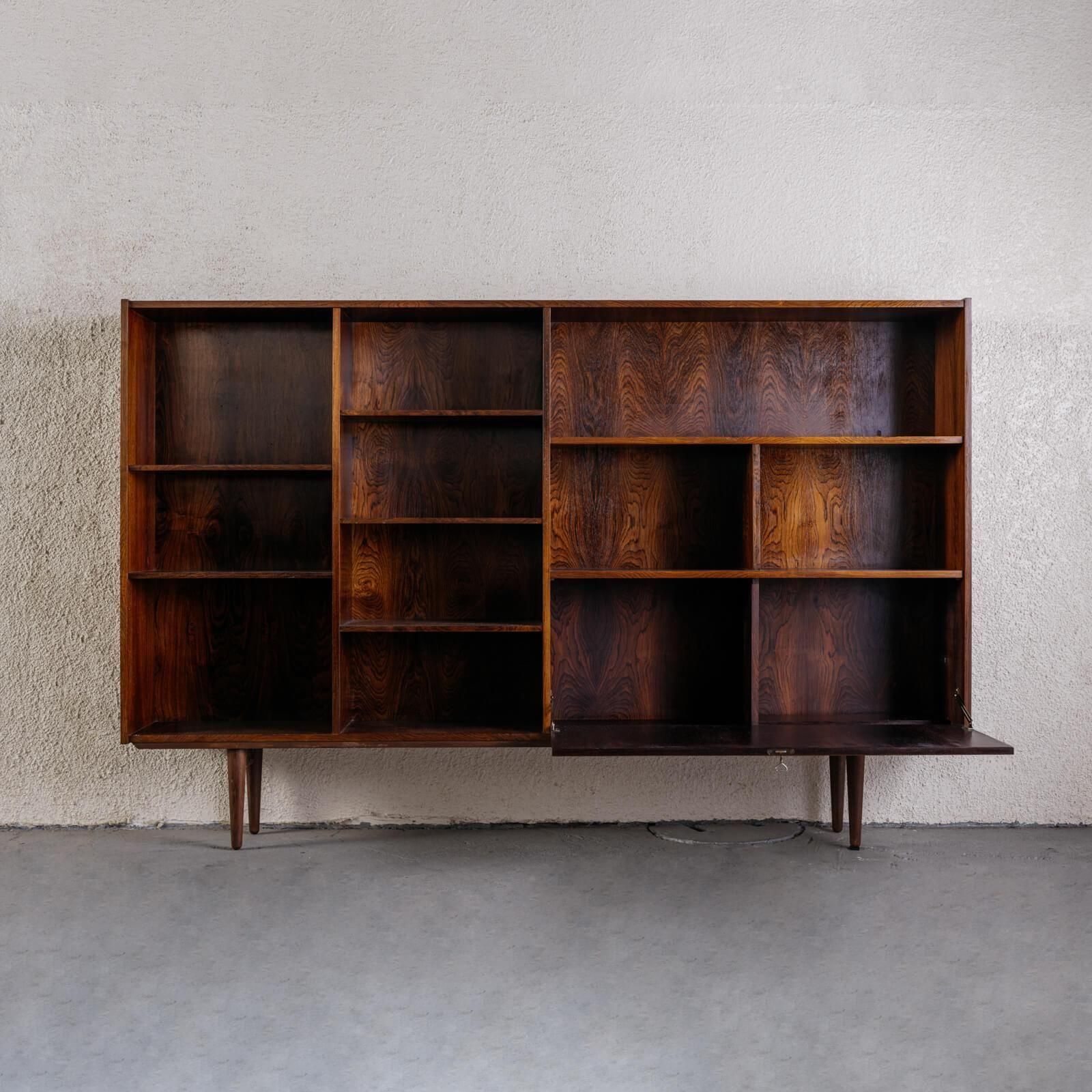 ローズウッド特有の深い木目が美しいデンマークビンテージキャビネット。棚の可動で使い勝手が良く、ディスプレイも収納も楽しめます。向かって右下段はフラップ扉付きで、見せる、隠すの両方に対応。北欧らしい脚のデザインが空間をスッキリ見せてくれます。