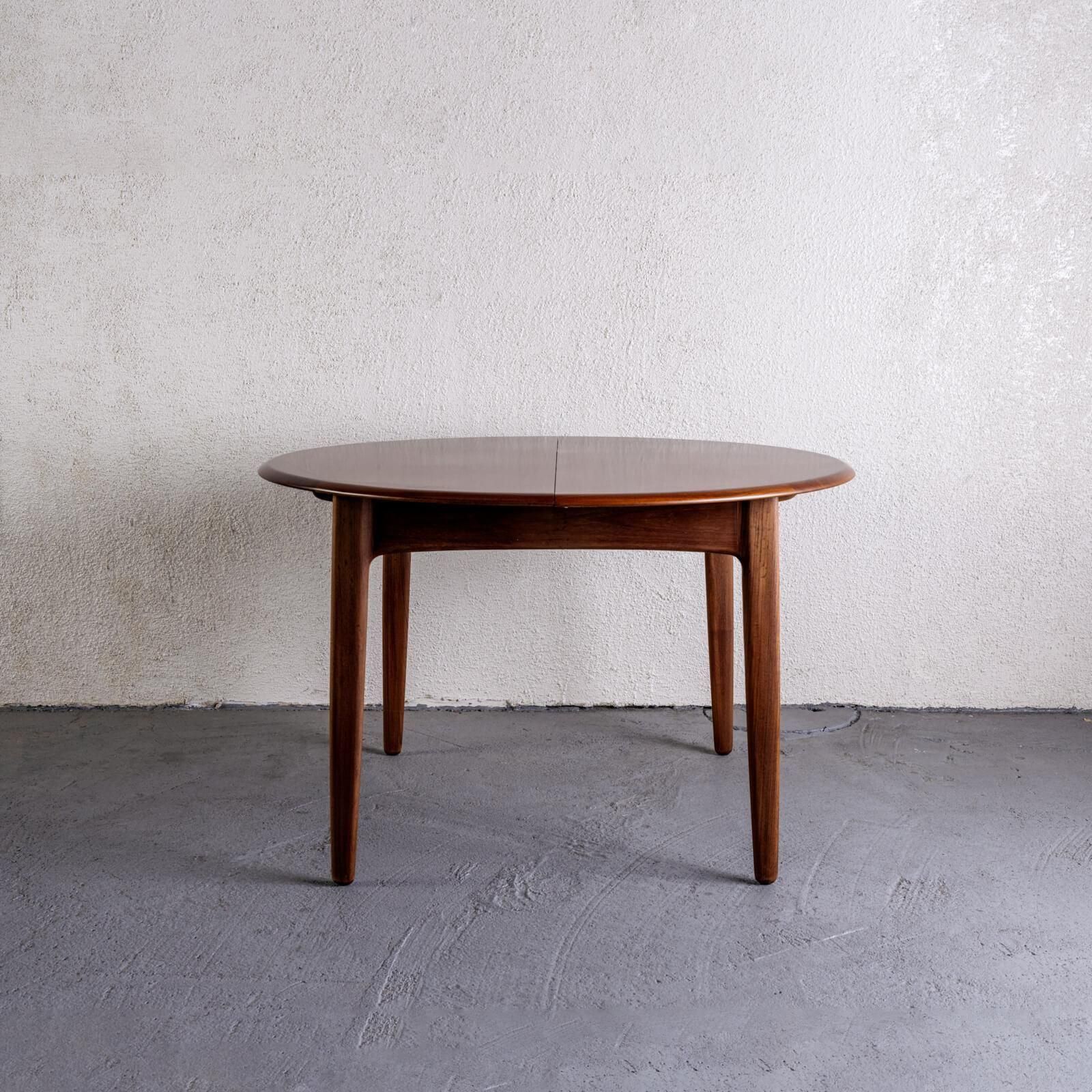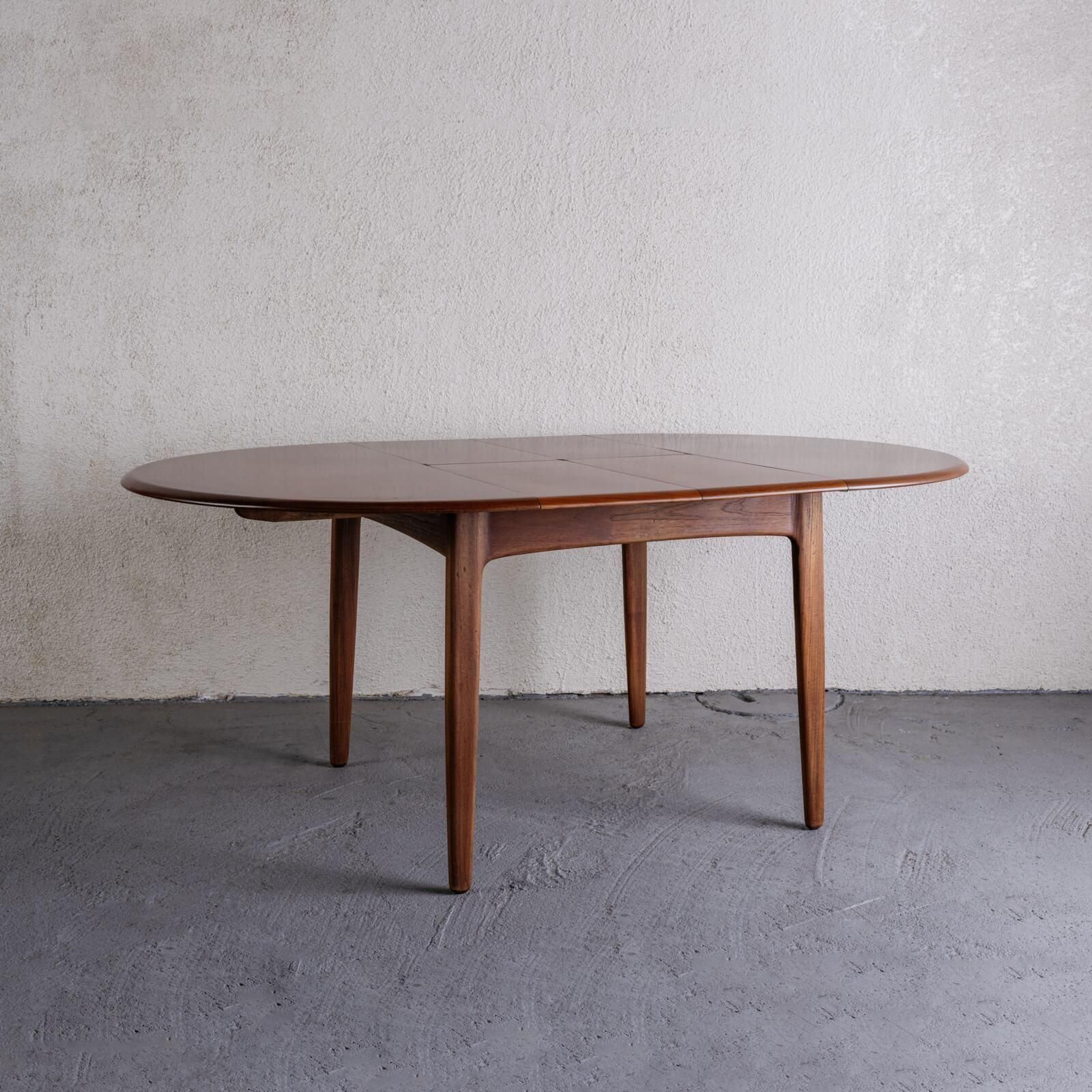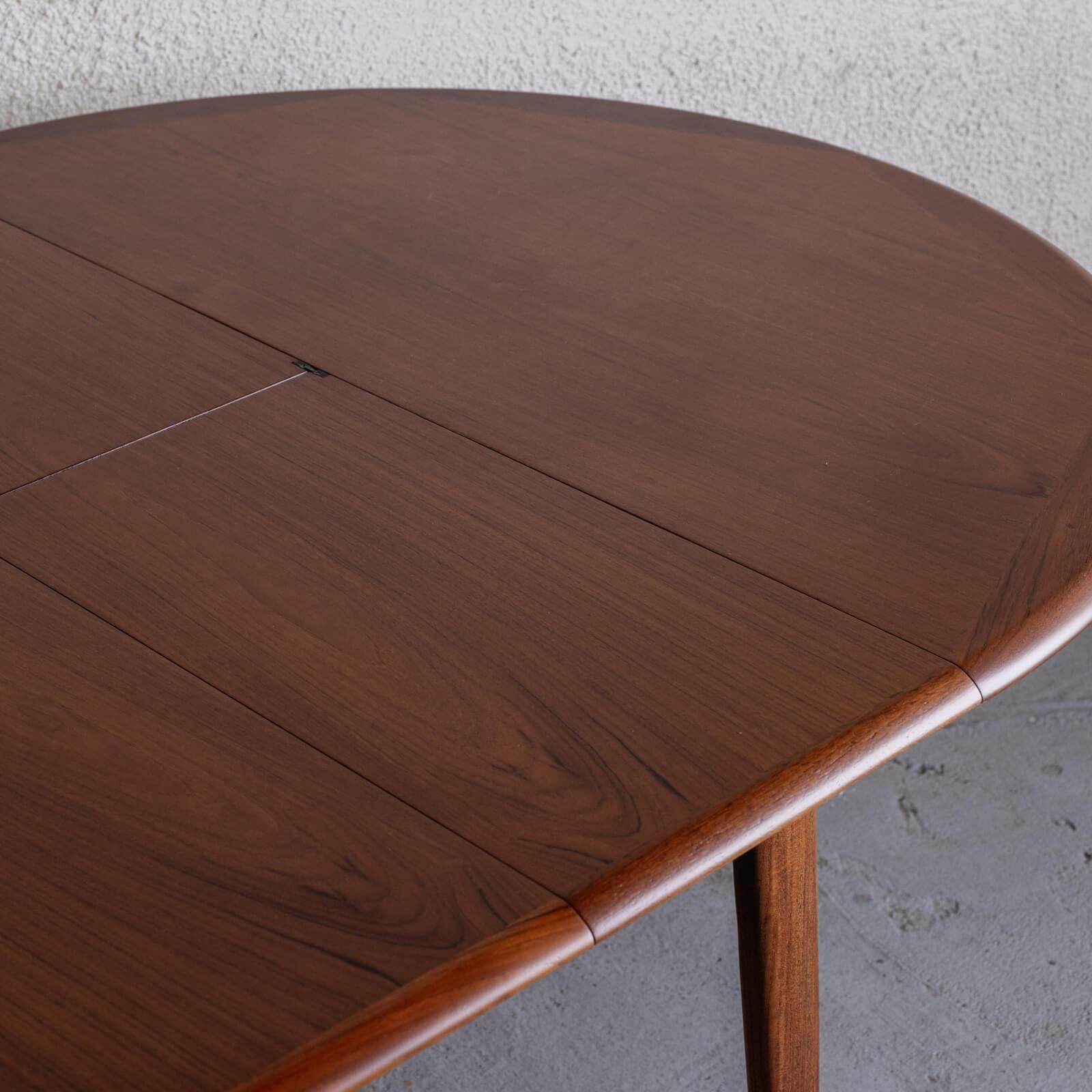 デンマークビンテージのチーク材エクステンションテーブル。中央を開くと拡張板が現れ、丸から楕円へと形が変わる機能的なデザインです。柔らかなラインと細身の脚で、空間を軽やかに見せてくれる一台。