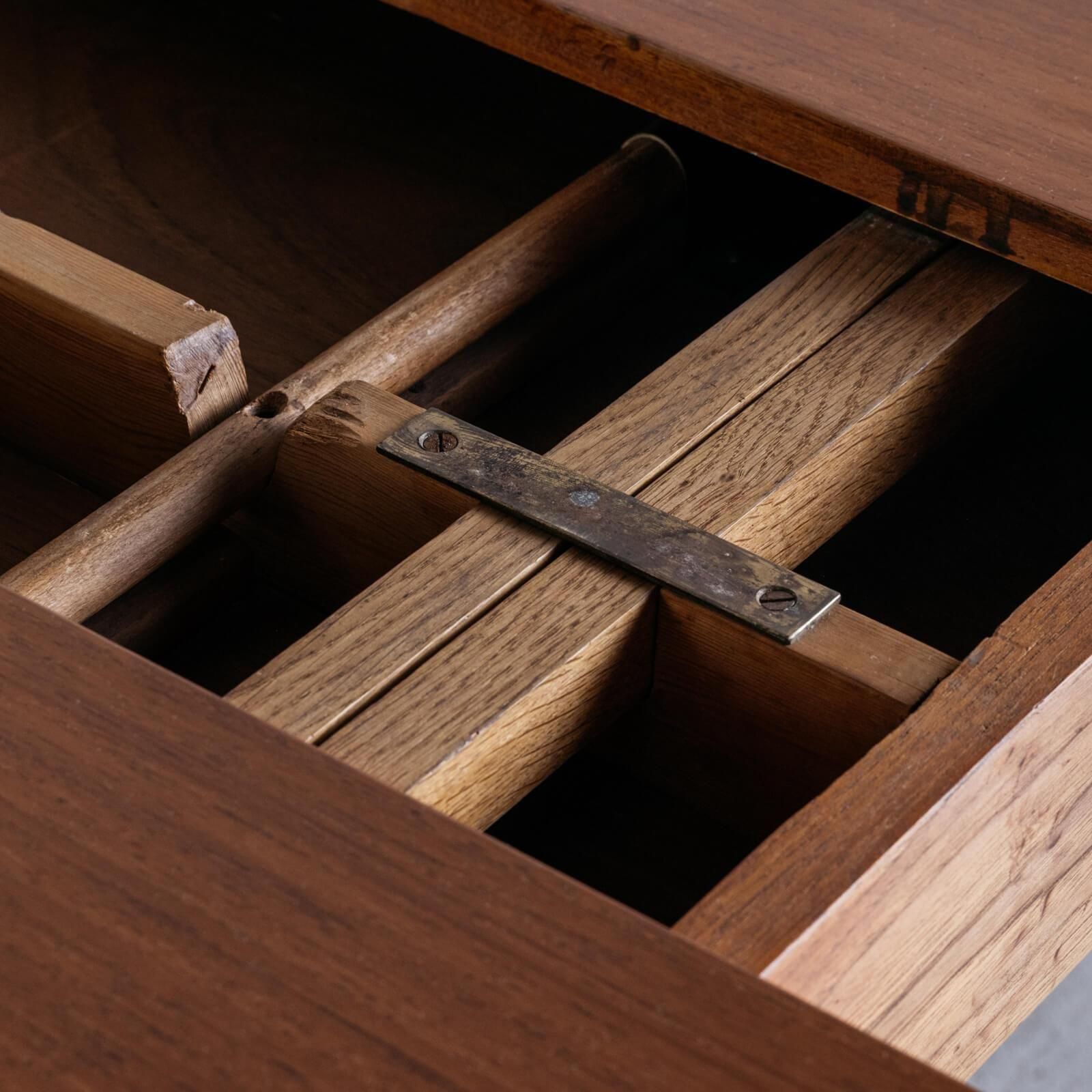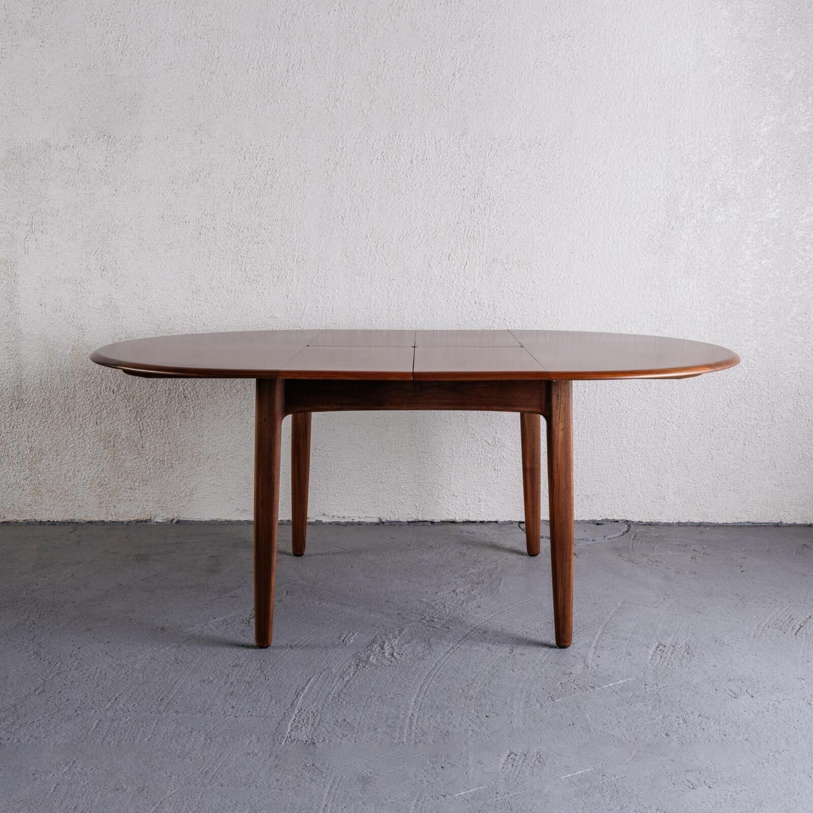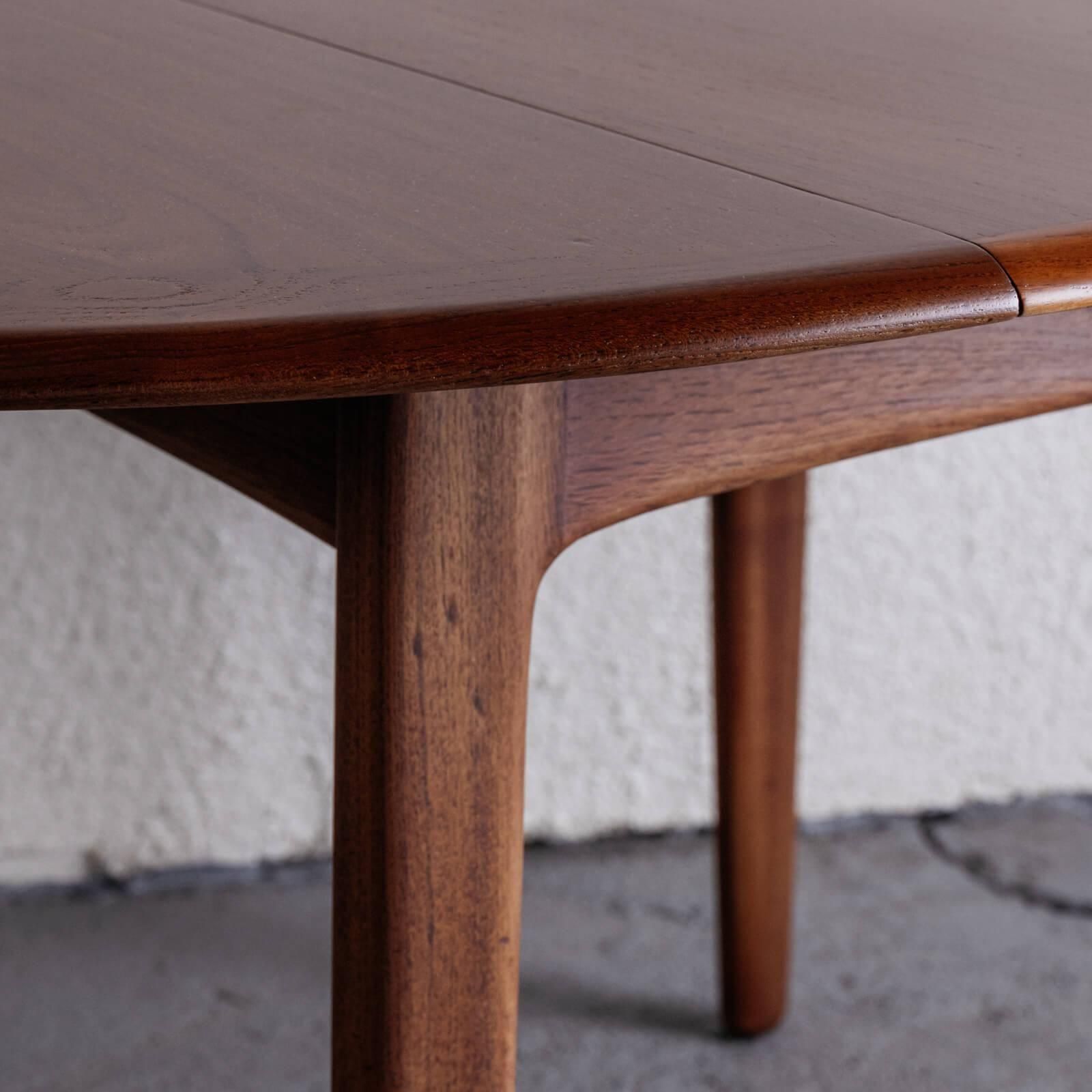 デンマークビンテージのチーク材エクステンションテーブル。中央を開くと拡張板が現れ、丸から楕円へと形が変わる機能的なデザインです。柔らかなラインと細身の脚で、空間を軽やかに見せてくれる一台。