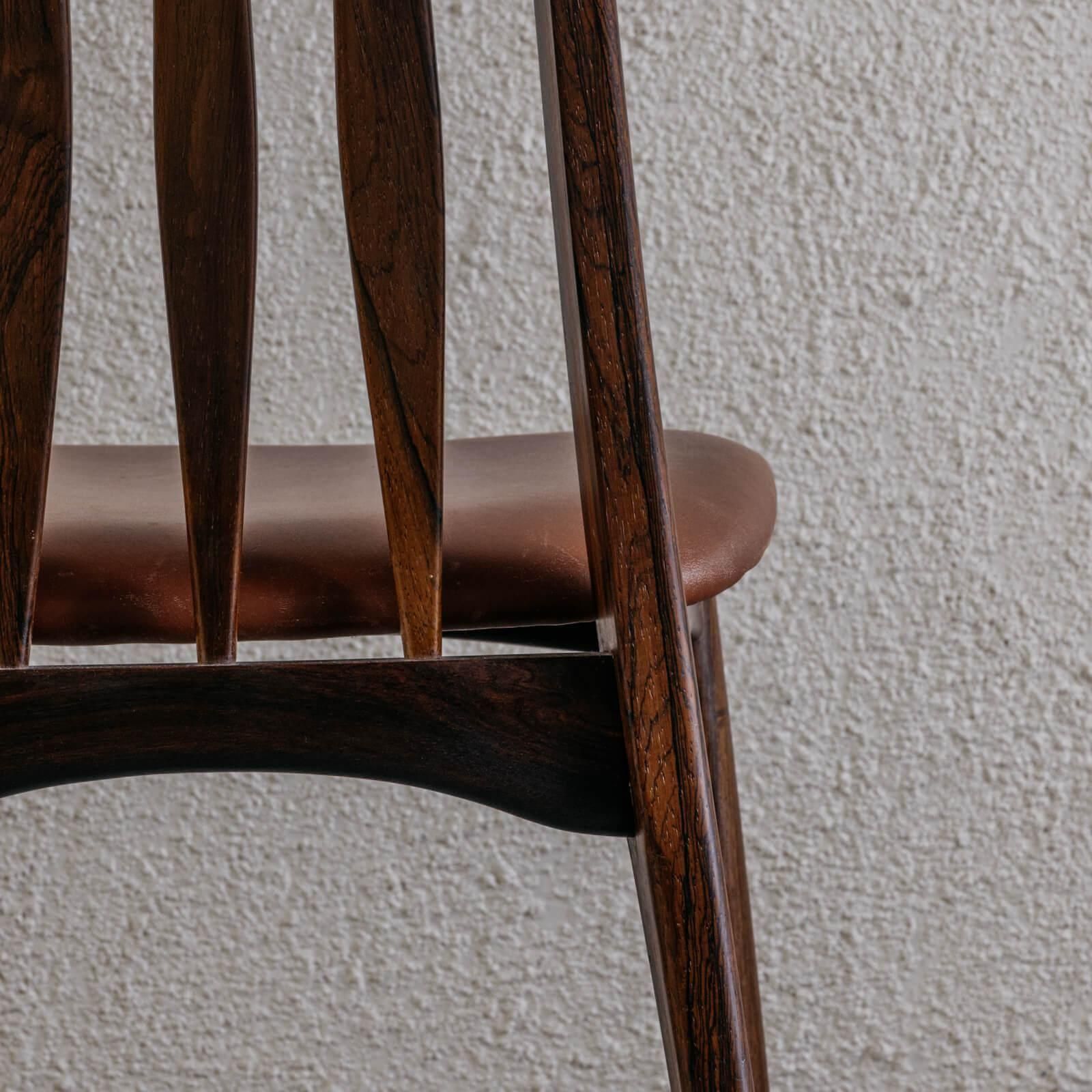 背もたれはすらりと伸びるスピンドル(縦桟)が特徴的で、上部に向かって優しくカーブしたラインが、視覚的な軽やかさと快適な背当たりを両立。ローズウッドの重厚な印象と細く繊細なシルエットの対比が、このモデルならではの魅力を引き立てています。