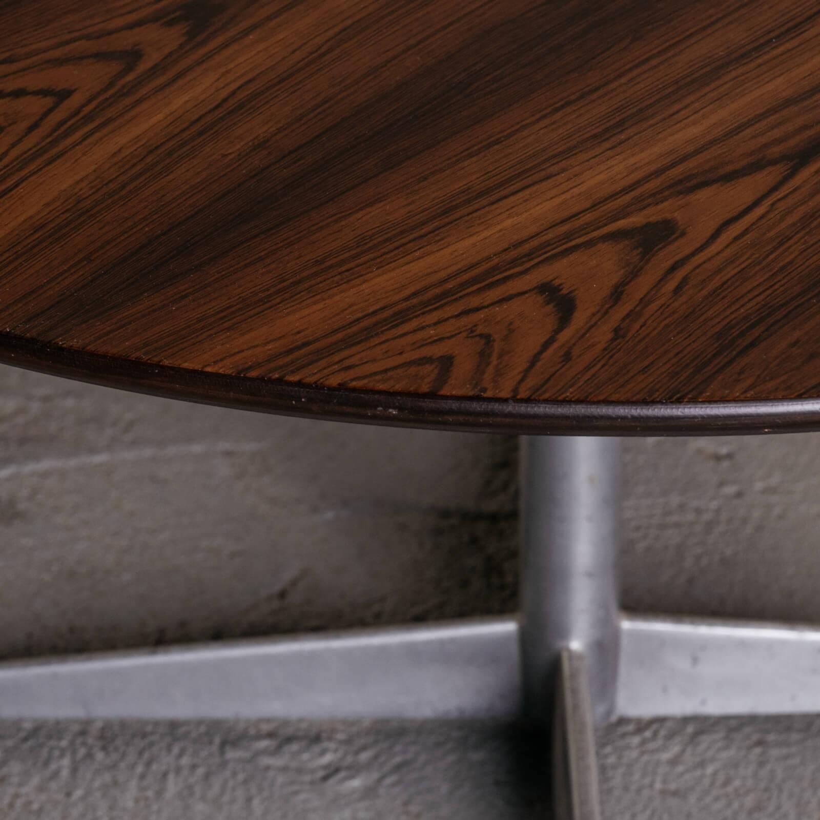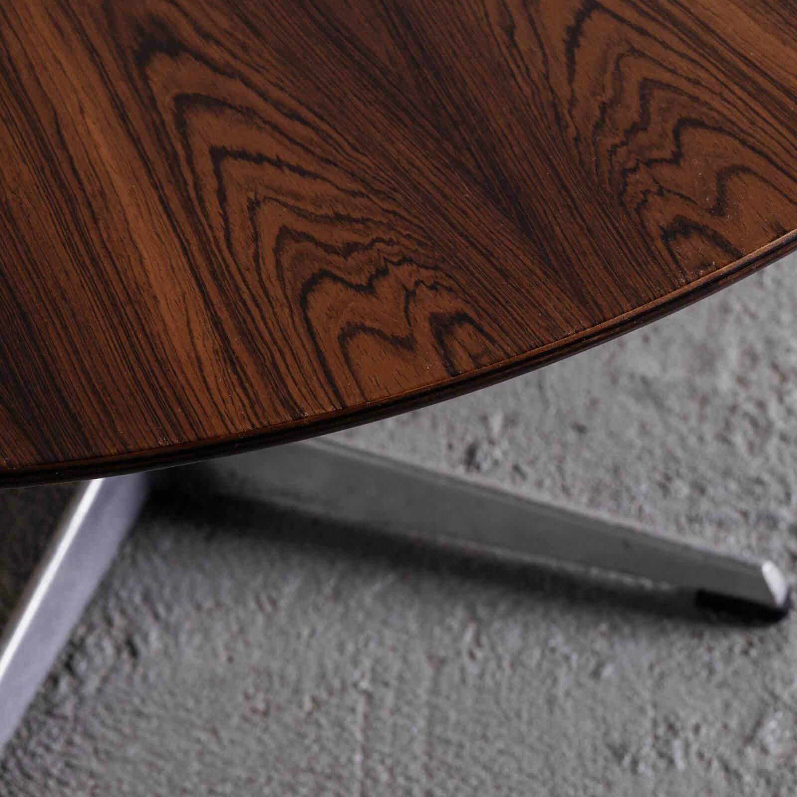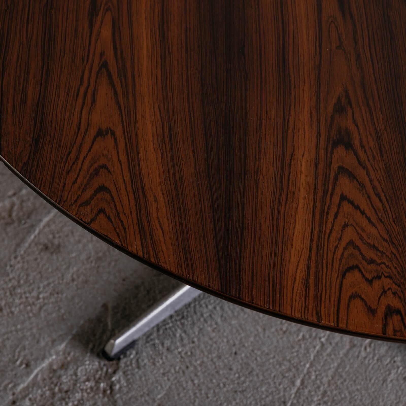 天板h美しいローズウッドで仕上げられ、深い色調と豊かな杢目が上質な存在感を放ちます。丸型のフォルムは空間に柔らかさと調和をもたらし、どの角度から見ても美しいシルエットを描きます。