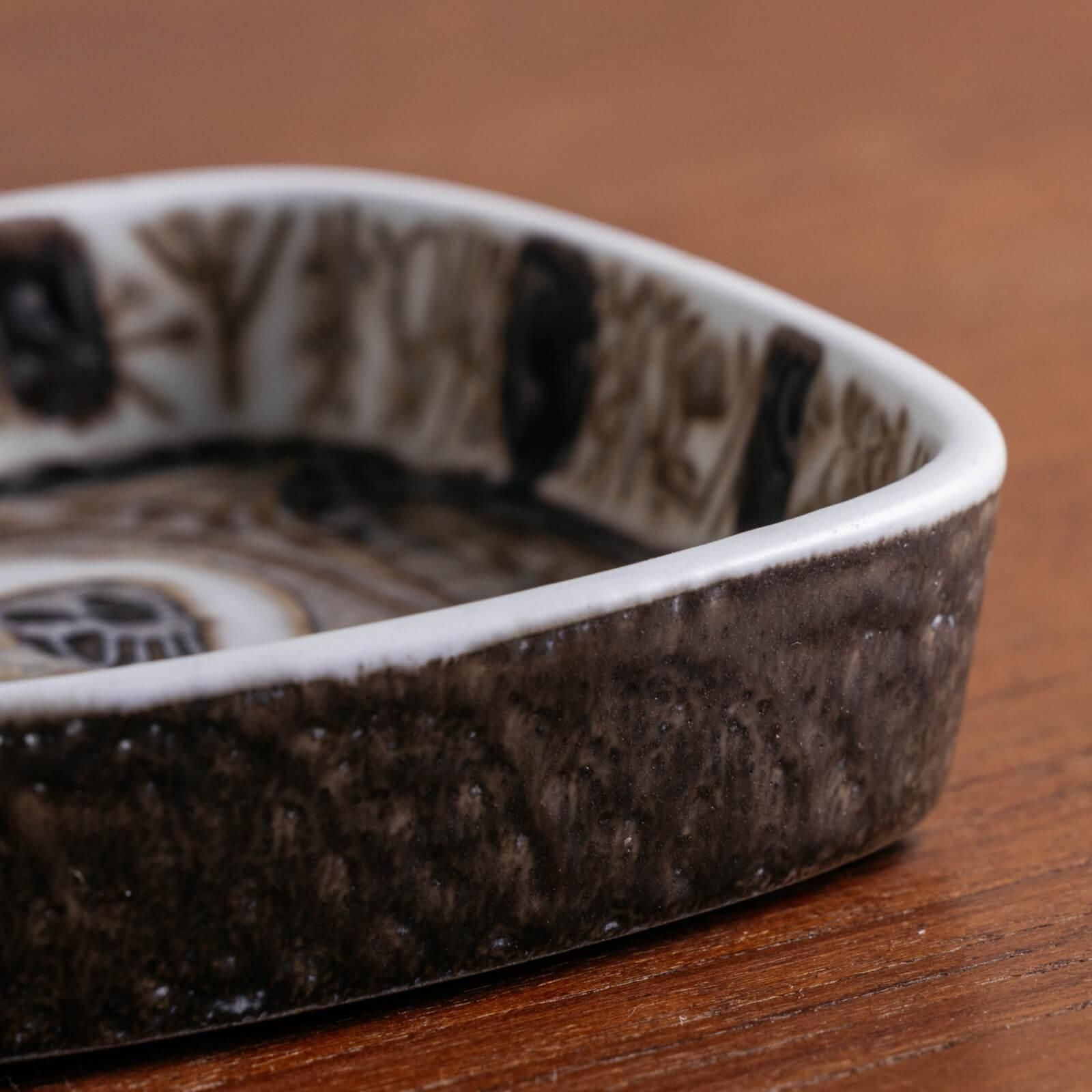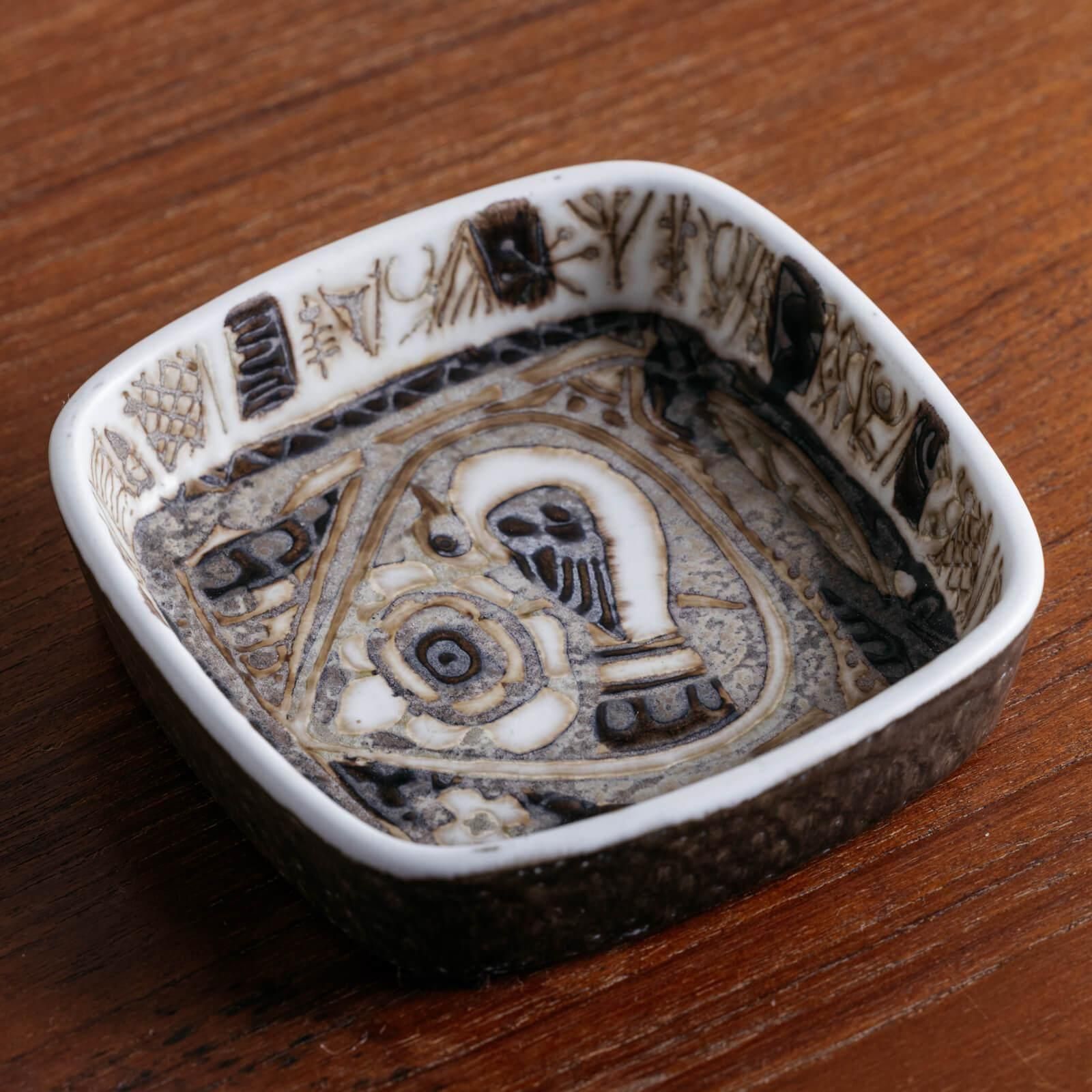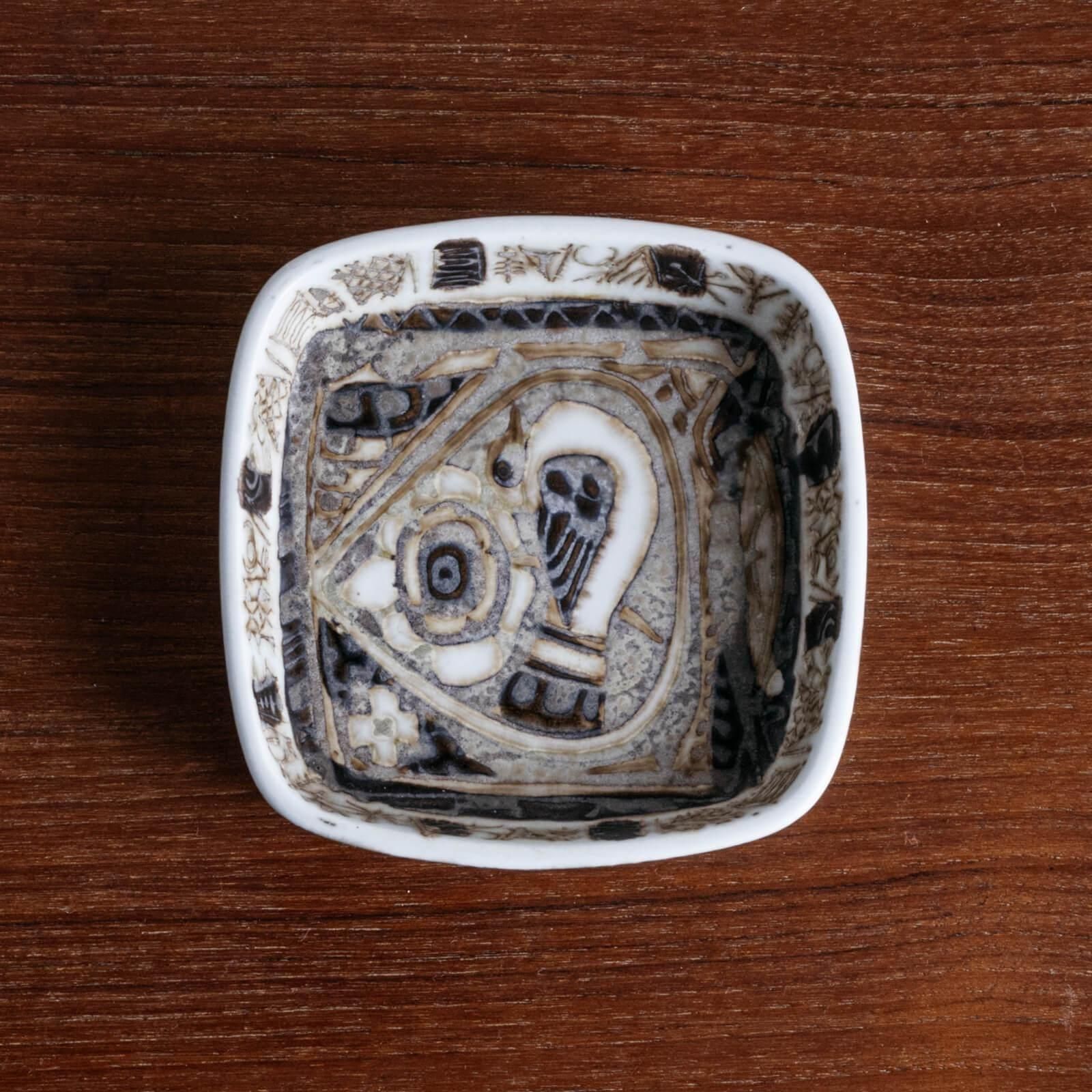デンマークの名窯 Royal Copenhagen(ロイヤルコペンハーゲン) による、BACA(バッカ)シリーズの11×11cmスクエアプレート。バッカシリーズの魅力である、ストーンウェアならではの質感と、複雑な手描き模様の組み合わせが際立つ一枚です。小ぶりながらも、深みのある色使いと抽象的な図案が強い存在感を放ちます。