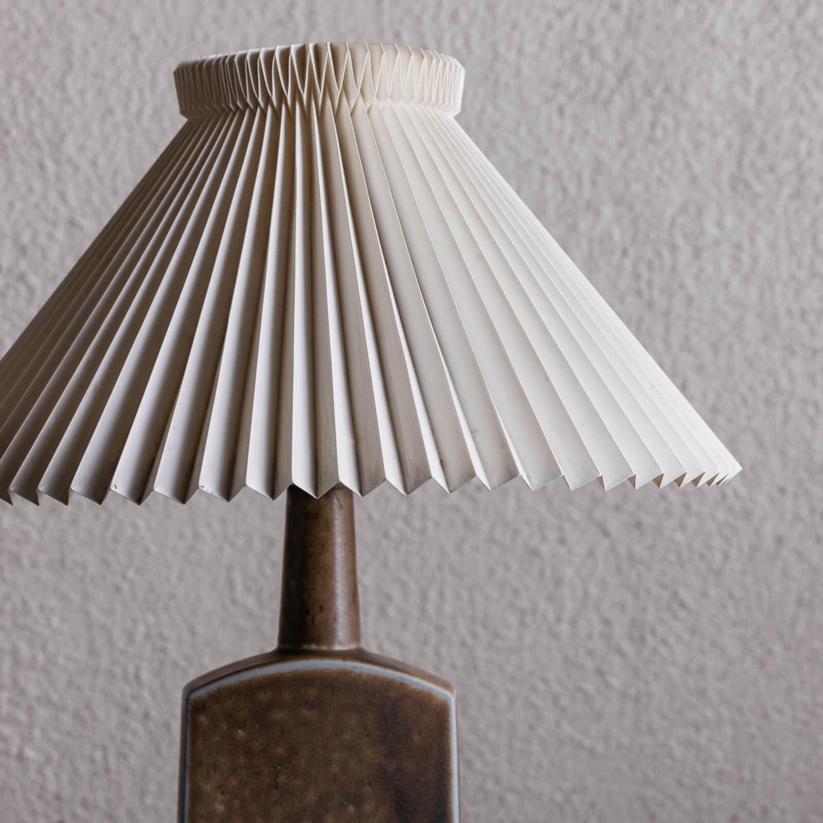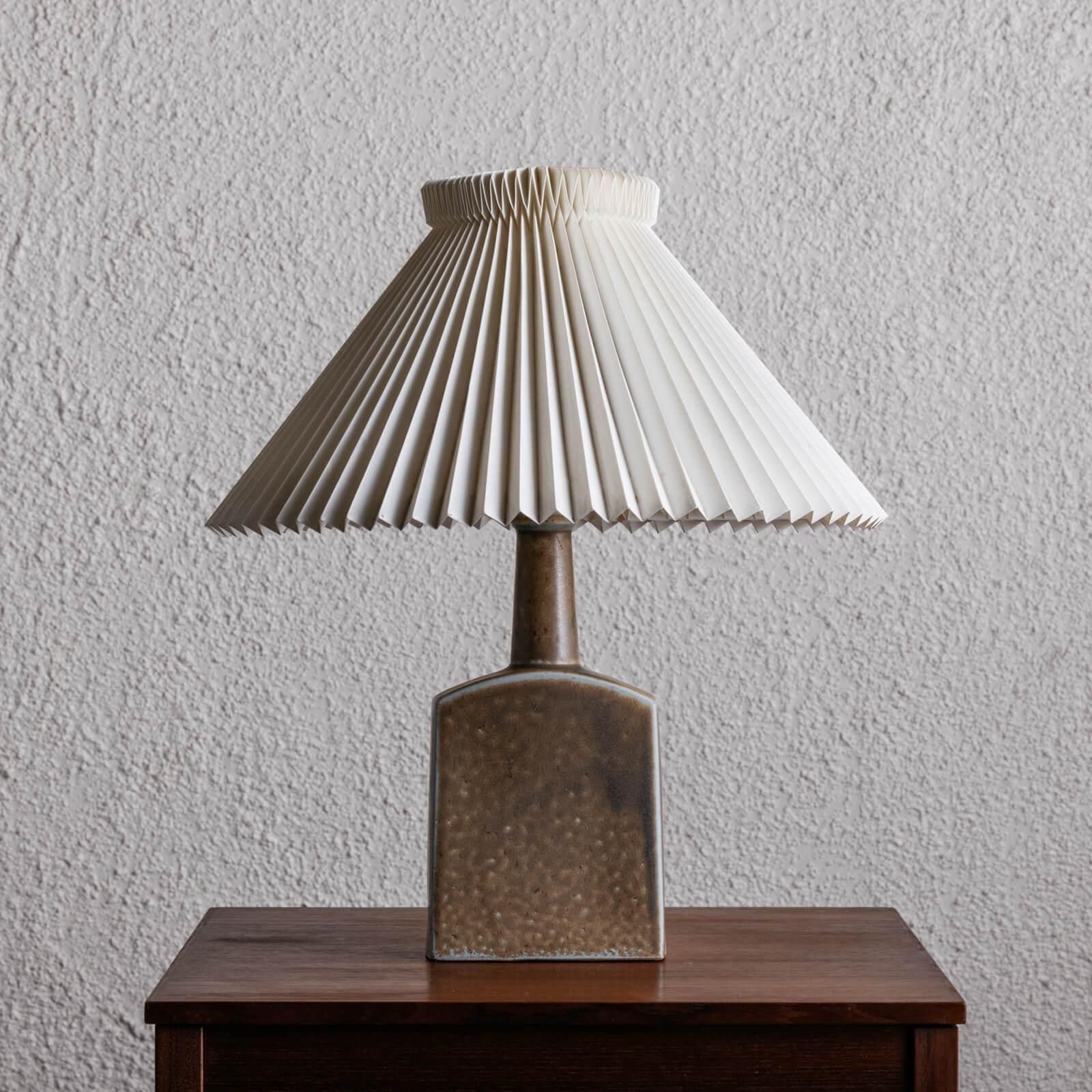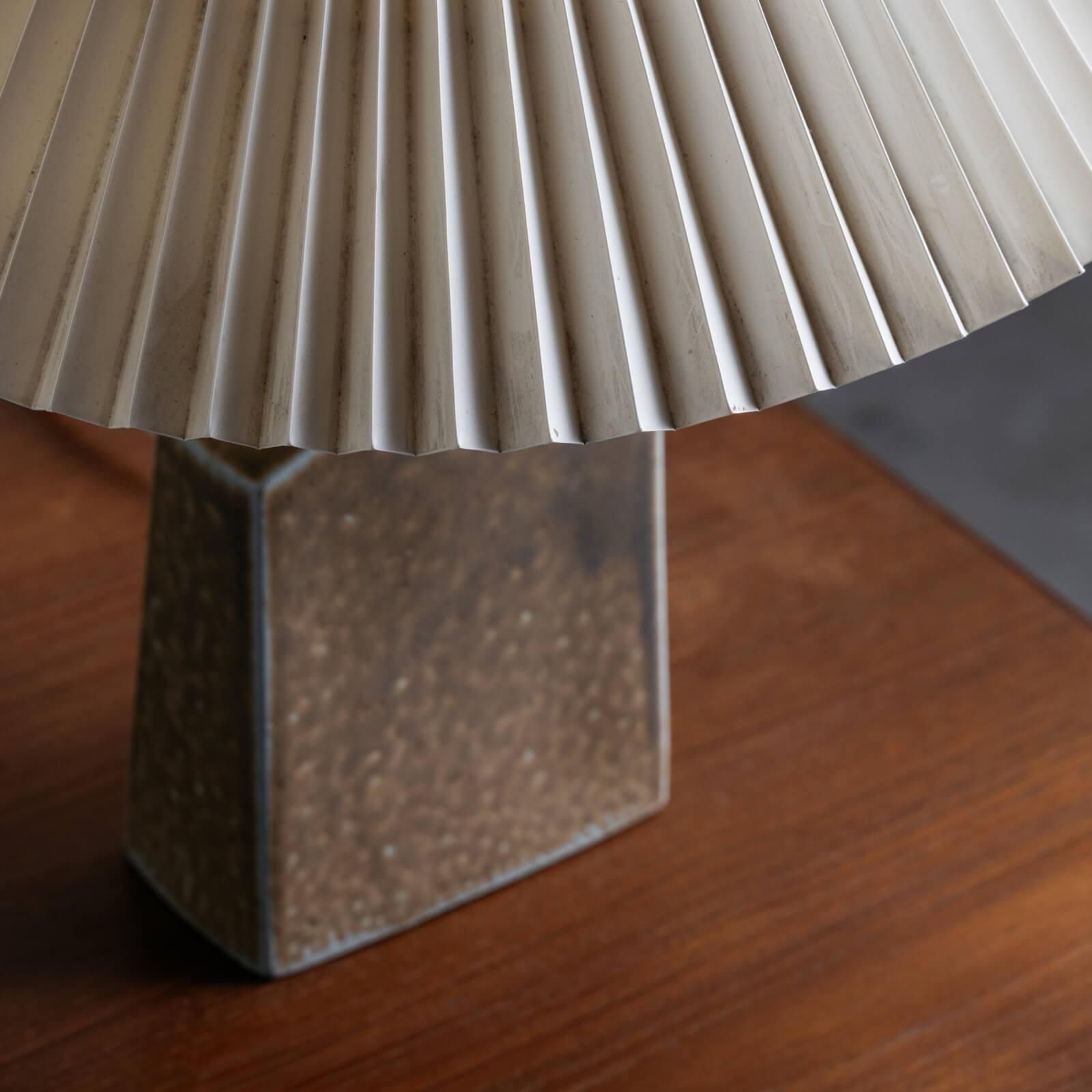 デンマークの老舗陶器メーカー Knabstrup(ナブストラップ) による、ヴィンテージのテーブルランプ。陶器ベースならではの温かな質感と、プリーツシェードの柔らかな光が魅力の一台です。 どっしりとしたスクエア型のベースには、ブラウン〜オリーブが溶け合うような釉薬がかけられており、表面に浮かぶ細かなまだら模様が静かな表情をつくり出しています。光が当たると釉薬の濃淡がふんわりと浮かび上がり、陶器ならではの深みのある風合いを楽しめます。
