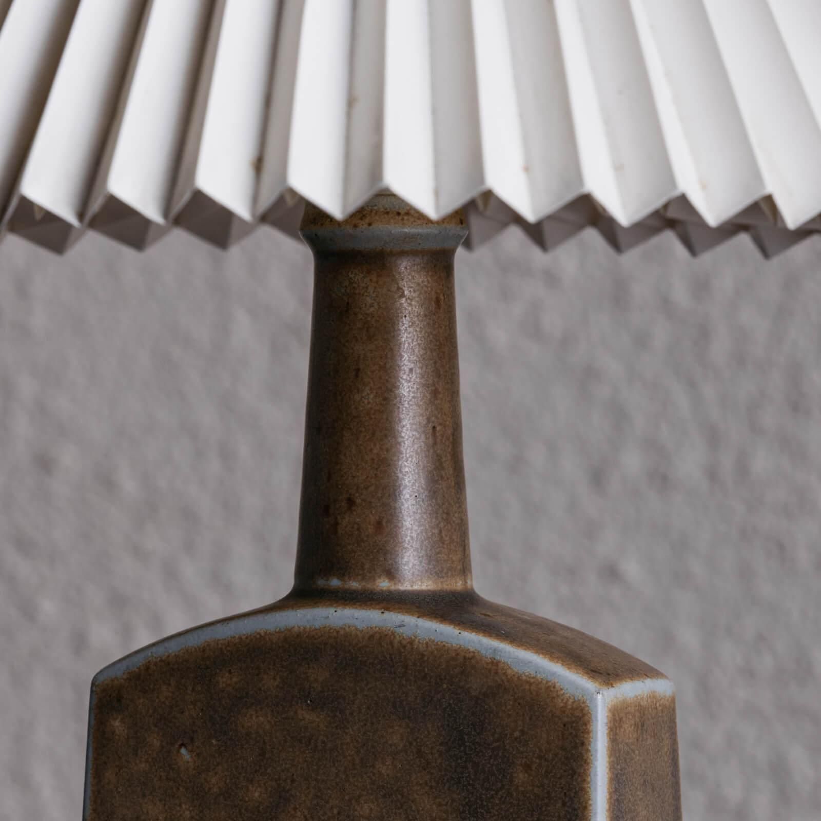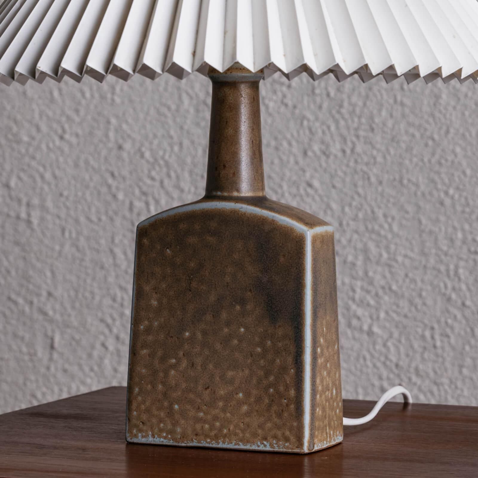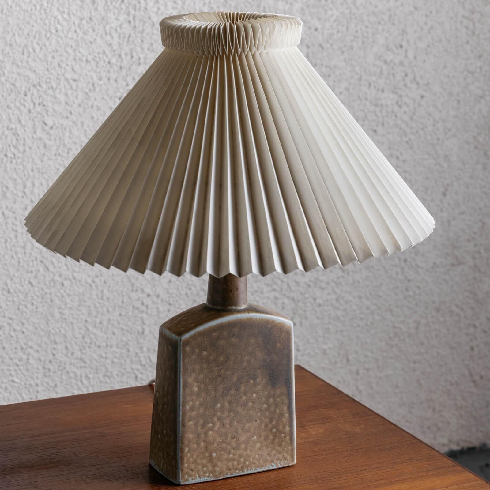 デンマークの老舗陶器メーカー Knabstrup(ナブストラップ) による、ヴィンテージのテーブルランプ。陶器ベースならではの温かな質感と、プリーツシェードの柔らかな光が魅力の一台です。 どっしりとしたスクエア型のベースには、ブラウン〜オリーブが溶け合うような釉薬がかけられており、表面に浮かぶ細かなまだら模様が静かな表情をつくり出しています。光が当たると釉薬の濃淡がふんわりと浮かび上がり、陶器ならではの深みのある風合いを楽しめます。