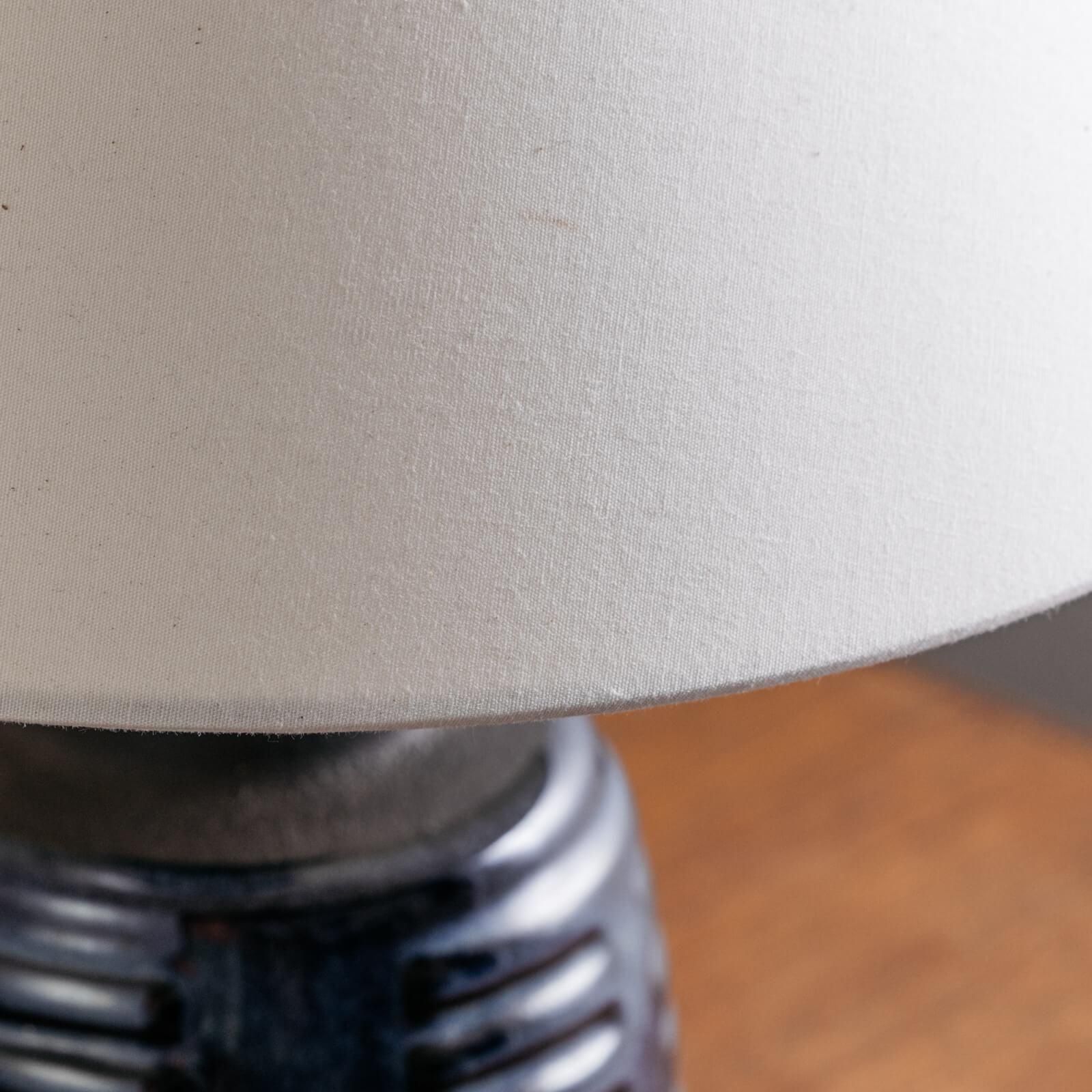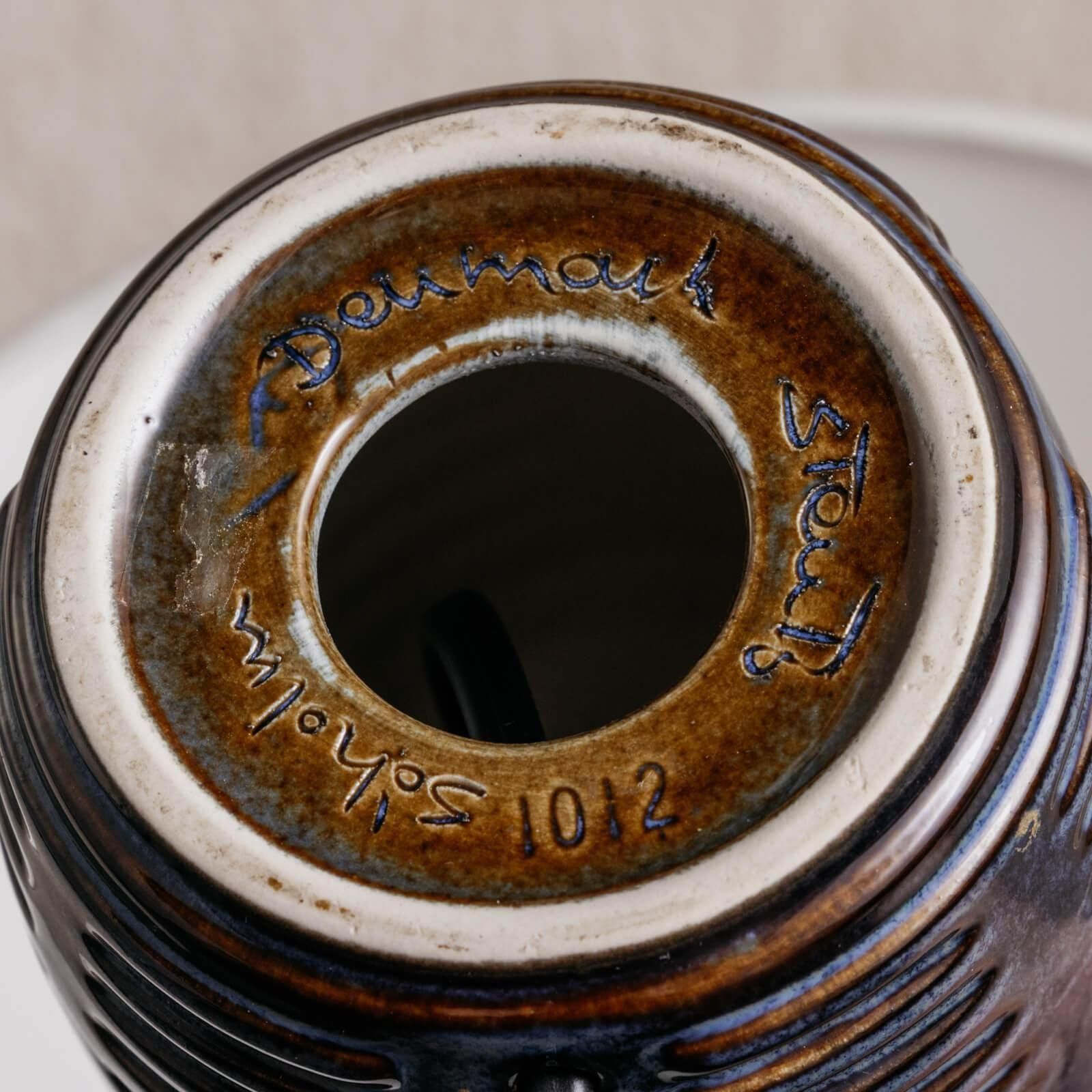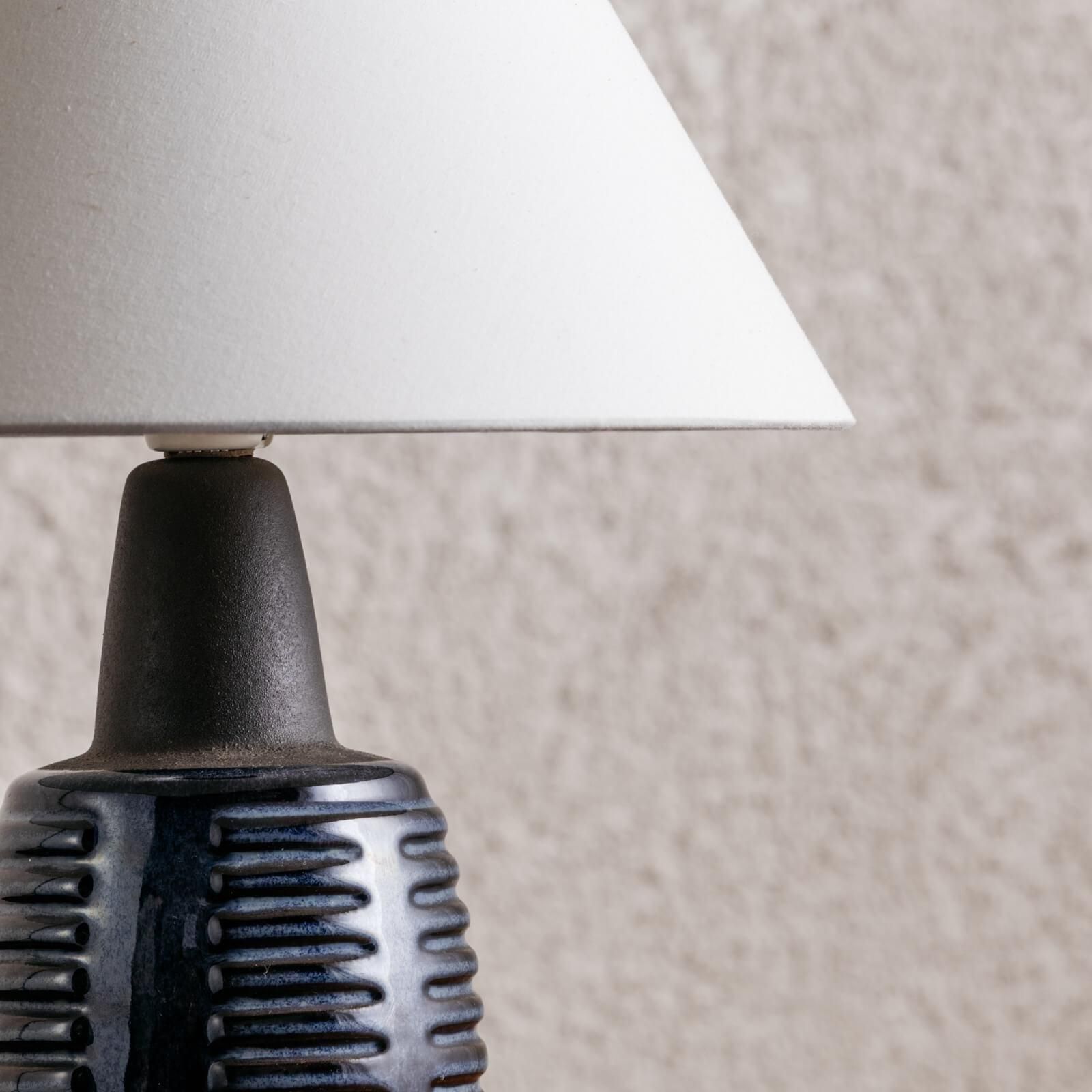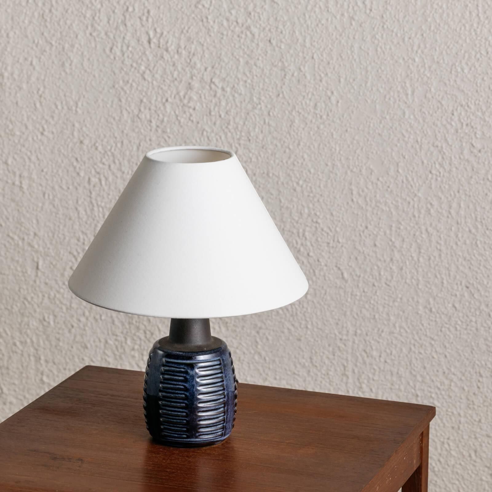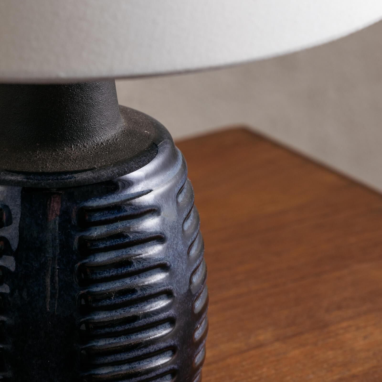 デンマーク・ボーンホルム島の名窯 Søholm(スーホルム) による、小ぶりで愛らしいヴィンテージ陶器ランプ。ブルーとネイビーを基調とした釉薬の美しい濃淡、そして縦のリズミカルなレリーフが印象的な一品です。 丸みを帯びたコンパクトなフォルムは、北欧陶器ならではのあたたかみを感じつつも、どこかモダンで上質。落ち着いた色味は、点灯時にやわらかな陰影をつくり、空間を静かに彩ってくれます。