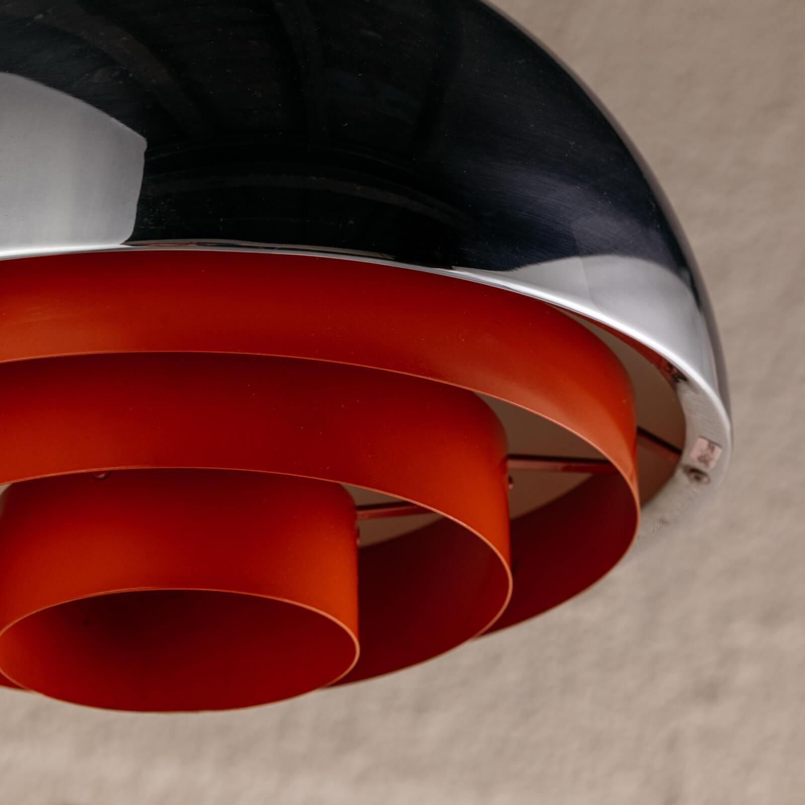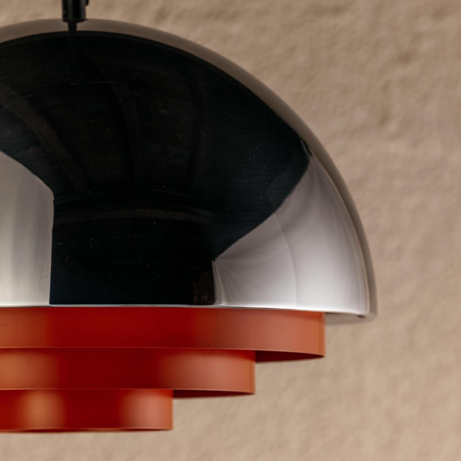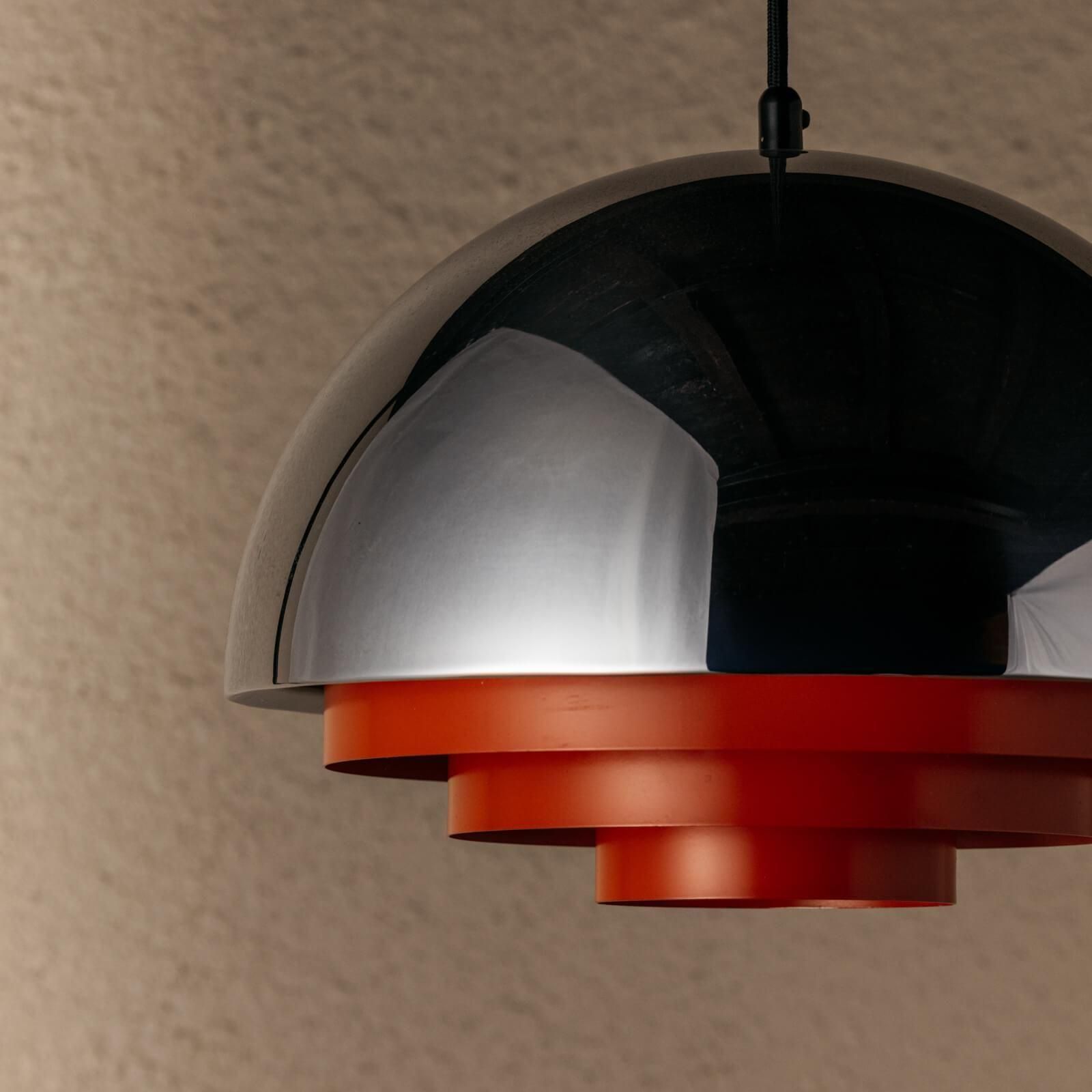 デンマーク・フォグアンドモーラップ社(Fog & Mørup)を代表するデザイナー、Jo Hammerborg(ヨー・ハーマボー)によるヴィンテージペンダントランプ。 その特徴は、ミラーポリッシュの半球シェードと、内側に重なるように配置された幾何学的なレッドのルーバー構造。光源を直接見せず、段階的に反射・拡散させることで、独特の奥行きと温かみのある光を生み出します。